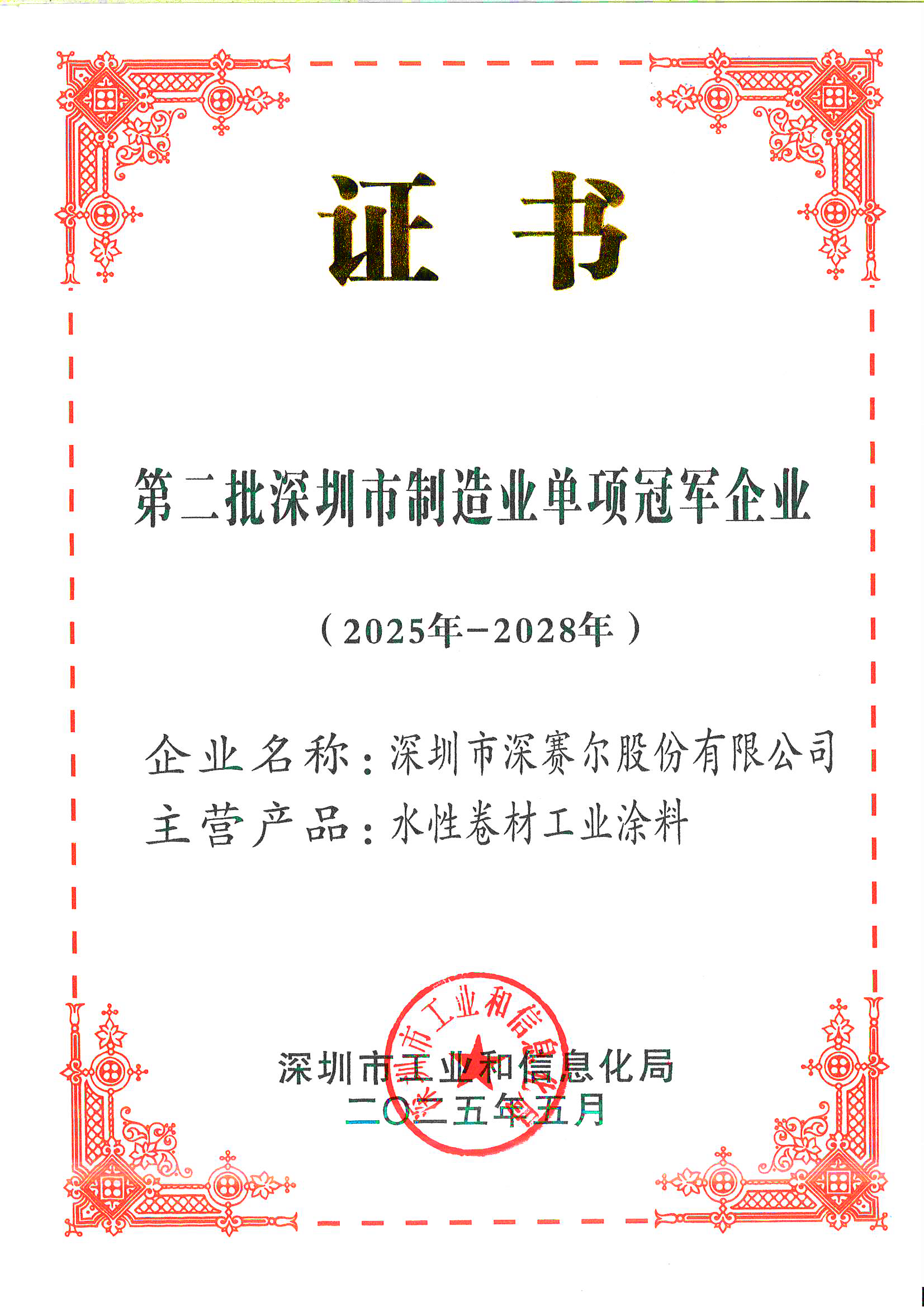 深圳市制造業單項冠軍企業證書